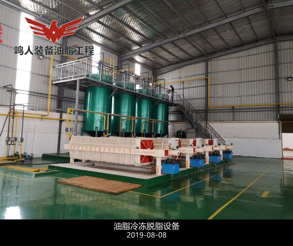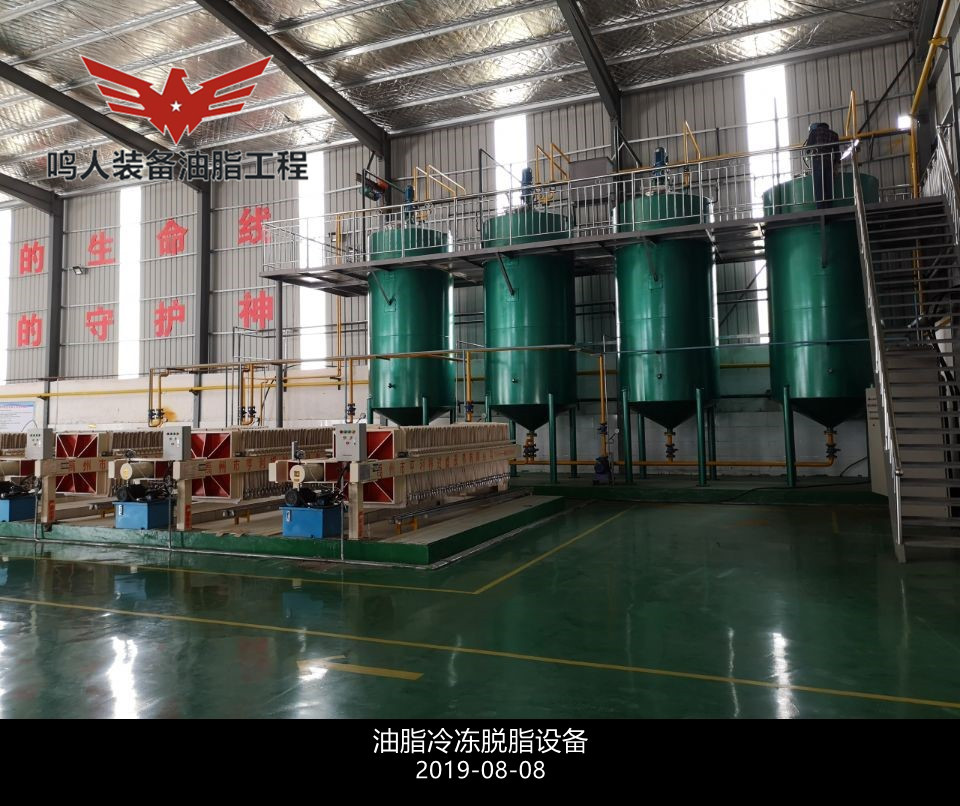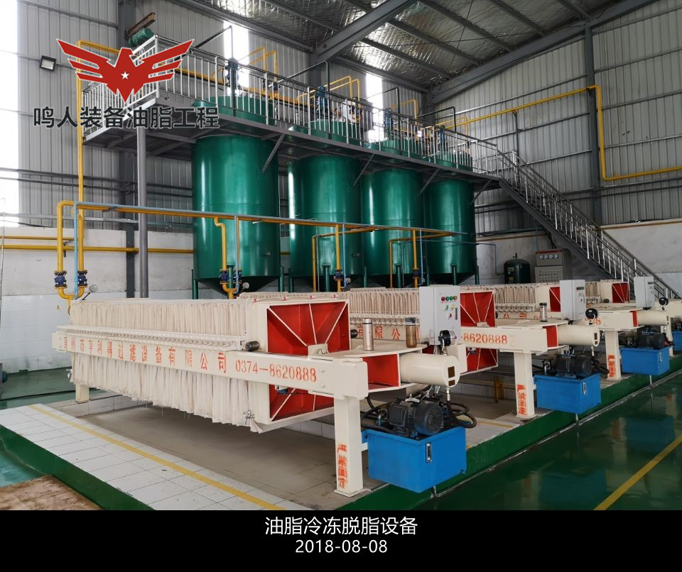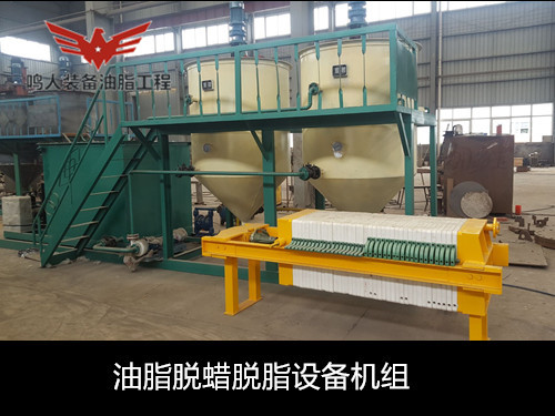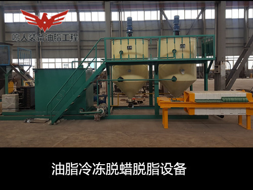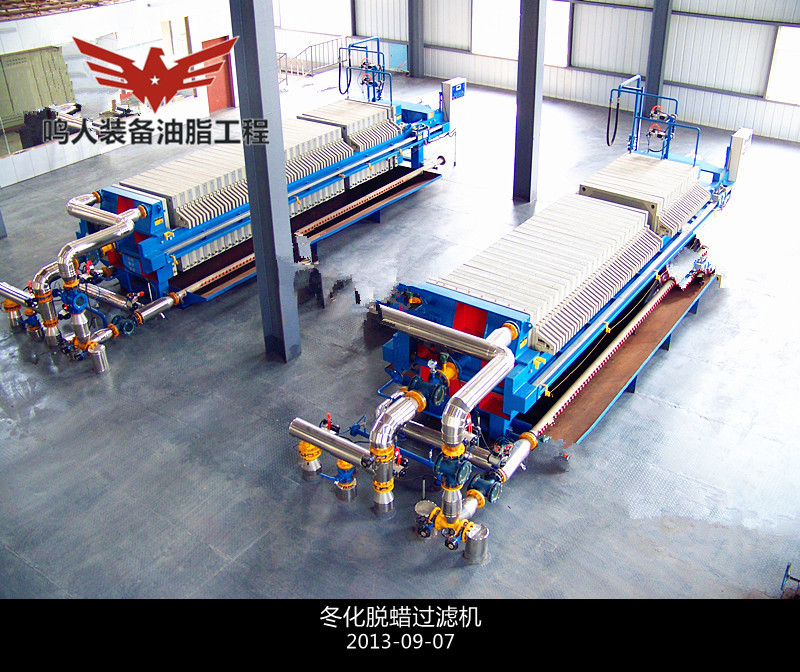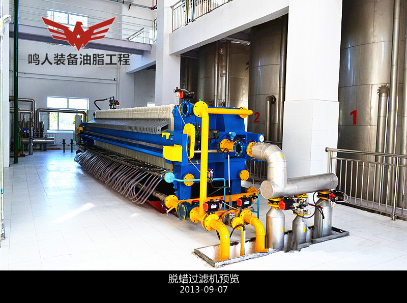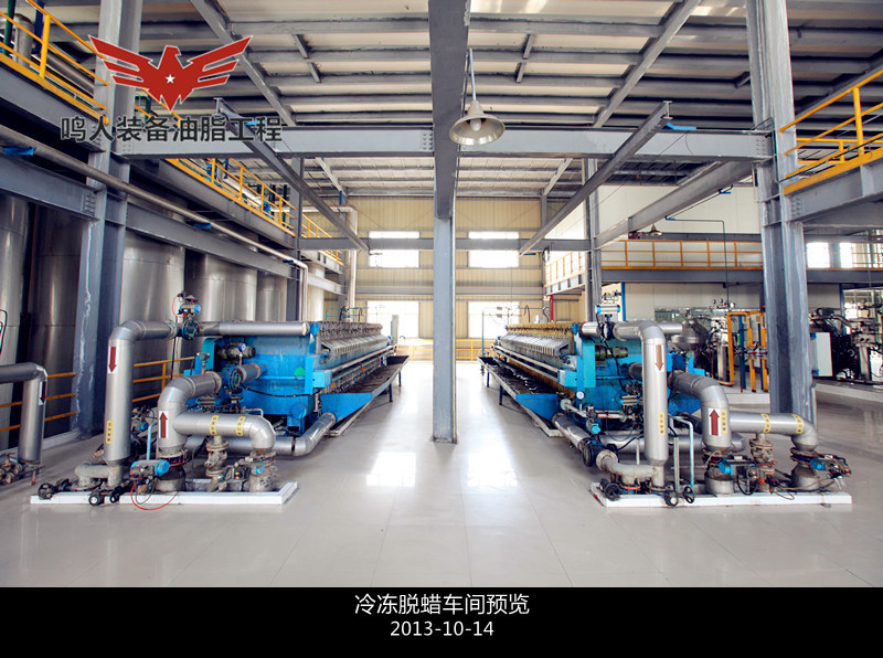 低溫脫蠟即單靠冷凍結(jié)晶,然后用機(jī)械方法分離油、蠟而不加任何輔助劑和輔助手段的脫蠟方法。分離時采用加壓過濾、真空過濾和離心分離等設(shè)備。此法**簡單的是一次結(jié)晶、過濾法。將脫臭后的油脂(溫度在 50℃以上)移入有冷卻裝置的結(jié)晶養(yǎng)晶罐,慢速攪拌,在常壓下充分冷卻,整個冷卻結(jié)晶時間為48h,然后過濾分離油、蠟質(zhì)。過濾壓強(qiáng)維持在 0.3–0.35MPa,過濾后要及時用壓縮空氣吹出蠟中夾帶的油脂,濾出的油即為脫蠟成品油。